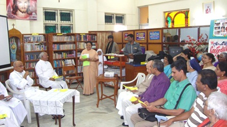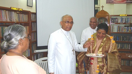 STAFF of Archdiocesan CEC BangaloreCEC SUNDAY 2014 at Infant Jesus Church, Viveknagar, BangaloreThe “handing over of THE KEY” took place formally during the “WELCOME” AND “FAREWELL” meeting on 11th March 2015. Following are pictorial highlights… Rev. Sr. Clare C. L, dsp, thanked all the persons who have been part of the CEC mission especially during this, her nine-year term, using Philippians 1: 3-5This moving movement of gratitude is now recorded – when Archbishop Most Rev, Dr. Bernard Moras thanked Rev. Sr. Clare C. L, dsp, for her commendable work at the Archdiocesan CEC, placing over her the golden shawl on behalf of the Archdiocese of Bangalore along with the sandalwood garland.Rev. Fr. J. Arokianathan, CEC’s Spiritual Director anchored this heart-warming Event, keeping everyone gathered, involved in the sentiments…Rev. Sr. Clare C. L, dsp, hands over “THE KEY” of the Archdiocesan CEC Office to Rev. Sr. Margaret Cruz, dsp, in the presence of the Sr. Superior for the Bangalore Community Rev. Sr. Vimala, dsp, and the patron of the Archdiocesan CEC Most Rev. Dr. Bernard Moras, Archbishop of Bangalore.It was also a very special time of WELCOME for the new directress Rev. Sr. Margaret Cruz, dsp… and she was formally blessed and invited into the CEC mission once again.CEC staff and co-workers arranged for a special cake signifying the dual ceremonies… that of WELCOME for Rev. Sr. Margaret Cruz, dsp, while FAREWELL for Rev. Sr. Clare C. L, dsp.National Director – Pontifical Mission Services, Rev. Fr. Faustine Lobo blessed the two Daughters of St. Paul, while wishing them all the very best in their onward missionary journey.And all the CEC FAMILY records this day with much prayer and thanks – giving, lots of love and hope…Rev. Sr. Margaret Cruz, dspRev. Sr. Margaret Cruz, dspRev. Sr. Clare C. L, dsp and Rev. Sr. Margaret Cruz, dsp