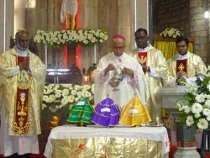 Archbishop Bernard Moras celebrated Chrism Mass at St.Francis Xaviers Cathedral at 5.00 pm with all the Priests of Archdiocese and Priests those who work in Archdiocese along with religious sisters and faithful, as sign of fraternity and presbyterium unity. During the homily Archbishop preached on year of mercy and the importance and sacredness of holy oils, also the incardination of Fr.Divya paul, priest belongs to Seoul congregation in to Archdiocese of Bangalore presbyterium was announced. After the mass the blessed holy oils were distributed at Cathedral CYC hall for all the Parish Priests and religious, the day got concluded with an agape at St.Francis Xaviers Cathedral Hall.